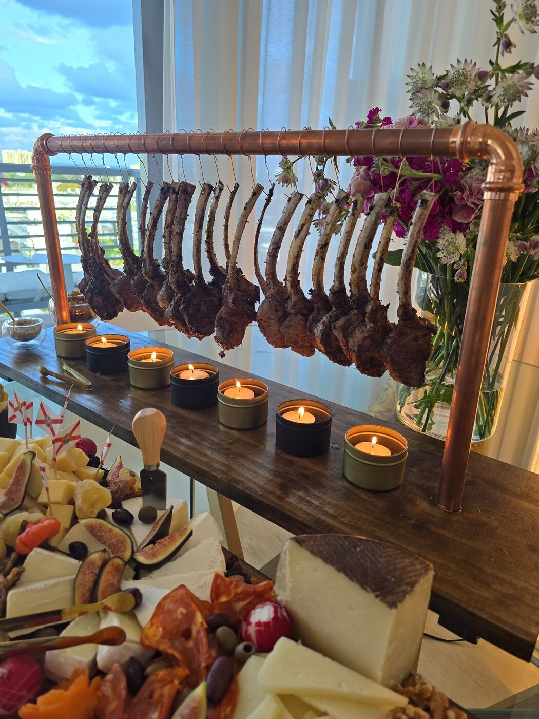 From dramatic copper rack displays to artisan charcuterie boards, every presentation is crafted to impress. 3D printed logos and laser-engraved elements available for branded events.